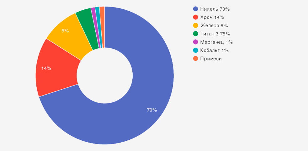 Никель (Ni) основа (> 70) Формирует аустенитную матрицу, обеспечивает коррозионную стойкость